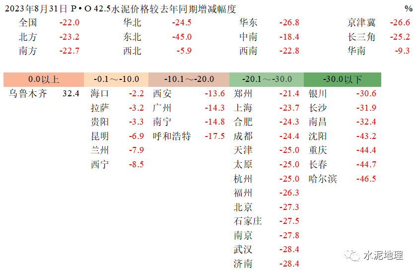8月31日,全国价格较去年同期下跌22.0%,南方下跌22.7%,北方下跌23.2%。西北下跌幅度最低5.9%;其次中南,18.4%;其他地区均在20%以上,东北高达45.0%。![]()