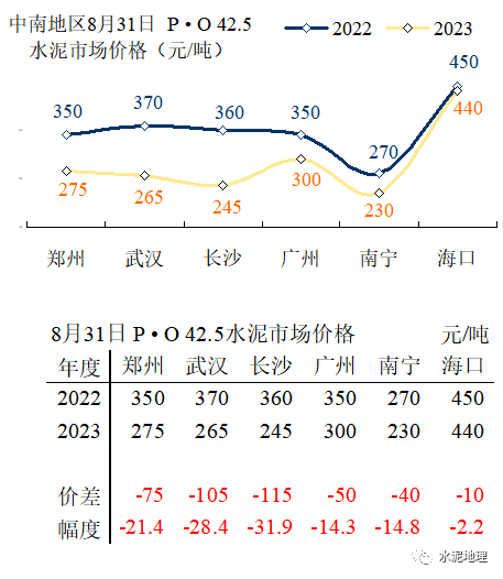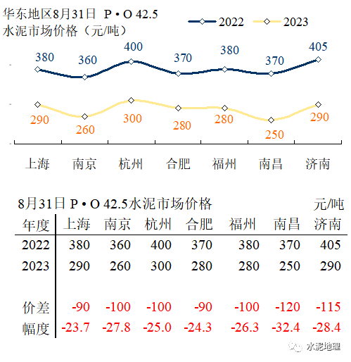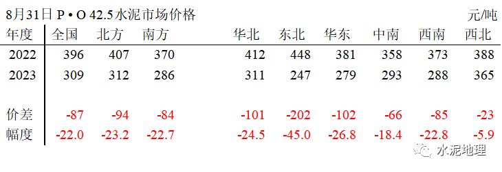 8月31日,全国P • O 42.5 水泥价格309元/吨。与2018~2022年同期价格平均价差100元/吨(上周94元/吨),与2022年价差87元/吨(上周83元/吨),价差放大。![]()