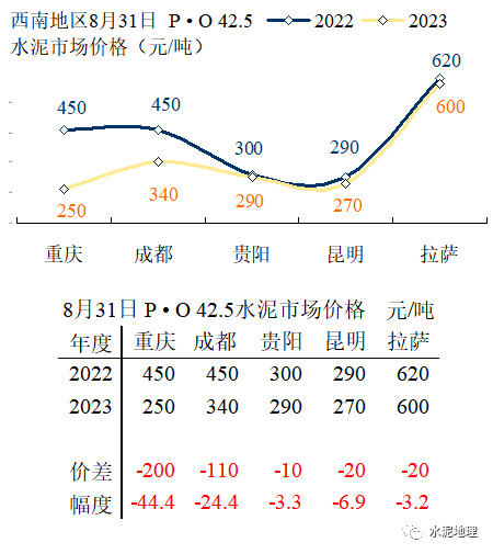 西南,区域间有很大差异。拉萨维持在高位;贵阳、昆明价格在低位,下跌空间不大;川渝两地相邻,重庆回旋余地小,东去水泥受阻,影响本地市场,价格大幅较去年同期下跌200元/吨,下跌44.4%;成都区域主导企业强势,价格维护能力强,8月上旬价格横在400,下旬不支,两次回调至340。![]()