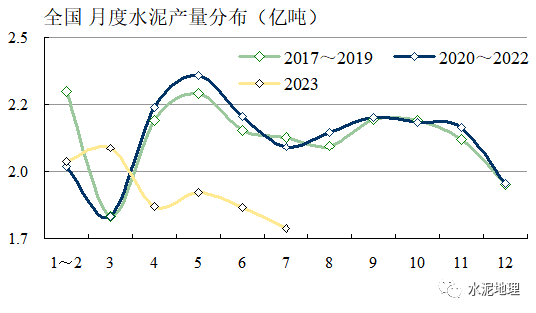 2014~2016年,3年平均产量 24.2亿吨;2017~2019年,水泥产量缓步下行,平均产量 22.9亿吨;2020~2022年,发生疫情,2020年上半年产量大幅回落,下半年和2021年上半年,水泥产量高企,2021年下半年水泥产量下行(注:2020、2021年平均产量23.7亿吨),2022年水泥产量下跌10%以上,跌至 21.2亿吨,拉低3年平均产量为 22.9亿吨;2023年上半年产量 9.5亿吨,较2014~2022年同期平均产量下降 10.7%,在低位运行,预计2023年水泥产量持平2022年。![]()