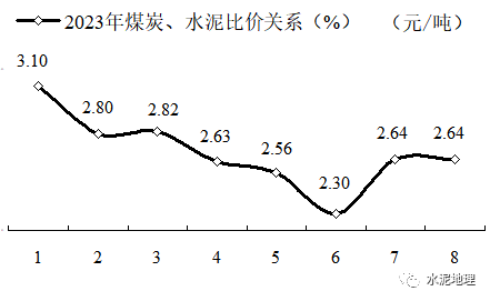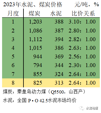 2023年8月,煤炭价格847元/吨(上月855),同比去年下降29.3%;水泥价格313元/吨(上月324),同比去年下降18.5%。煤炭价格下降幅度大于水泥,煤炭水泥比价2.64:1.00,齐平上月(去年同期煤炭水泥比价3.04:1.00)。![]()