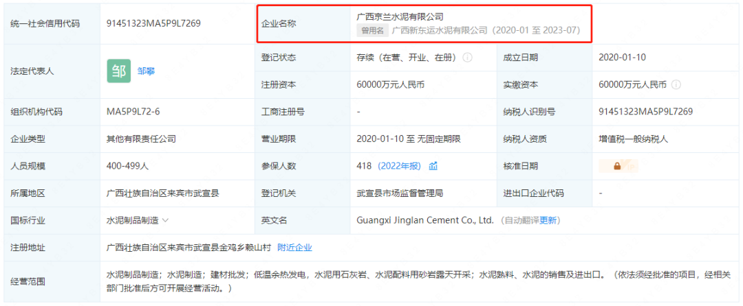 信息显示,近日,广西新东运水泥有限公司更名为广西京兰水泥有限公司。