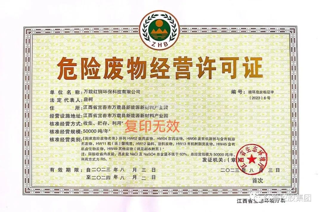 2023年8月4日,万载红狮环保获批江西省生态环境厅核发的《危废经营许可证》。万载废盐综合利用项目拥有国内首套最大规模废盐资源化处置设施,是江西省首家废盐综合利用经营单位,是集团首个脱离于水泥窑的危废处置项目,标志着红狮环保产业发展进入新阶段、开启了新篇章。