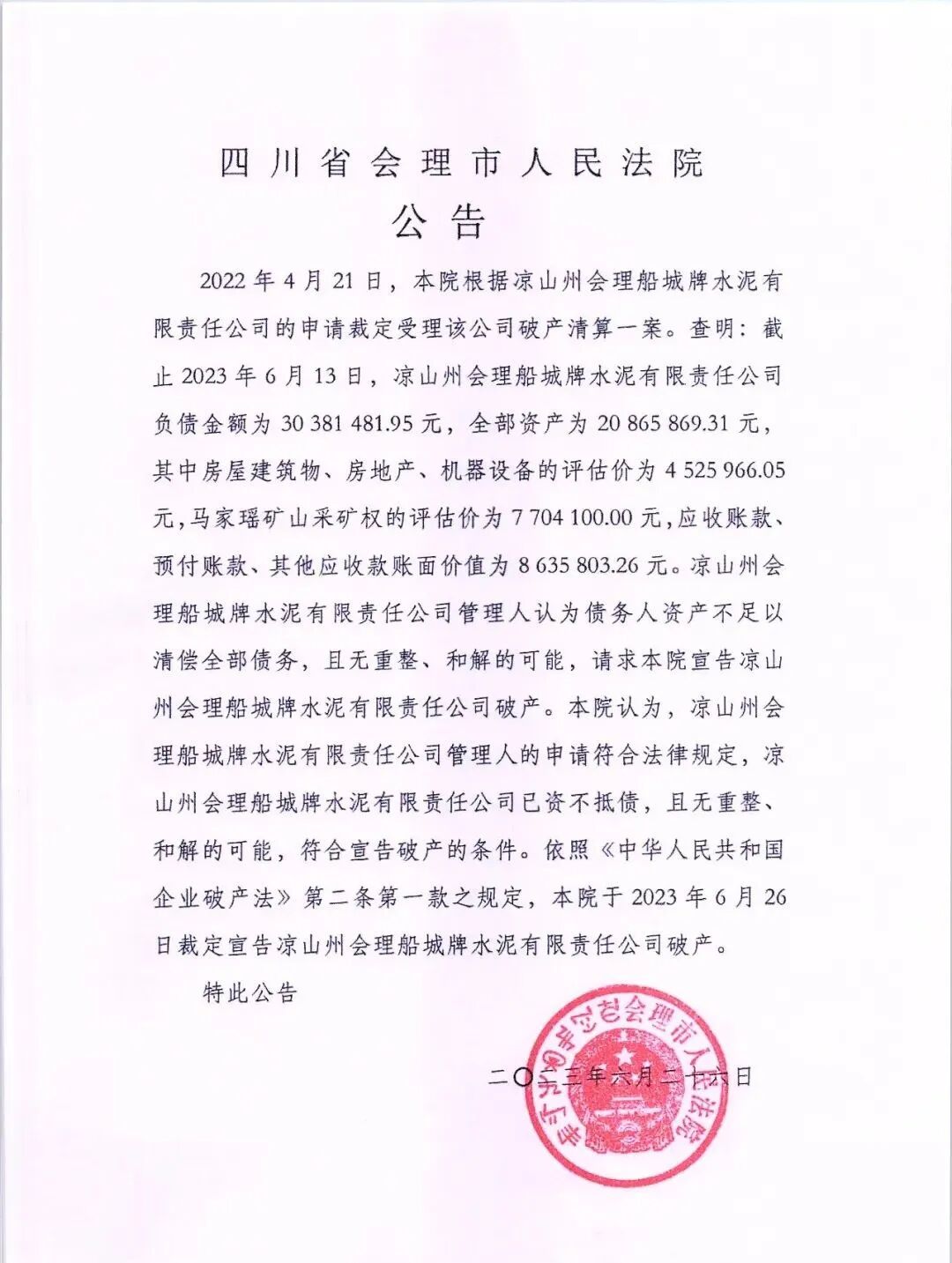 依照《中华人民共和国企业破产法》第二条第一款之规定,本院于 2023 年6月26日载定宣告凉山州会理船城牌水泥有限责任公司破产。