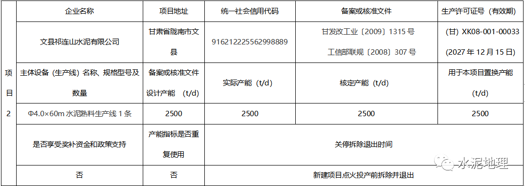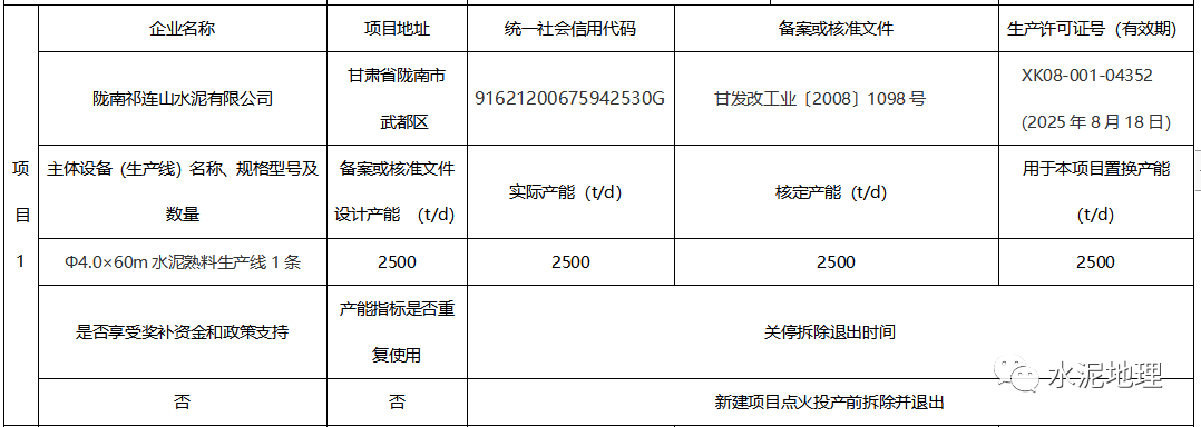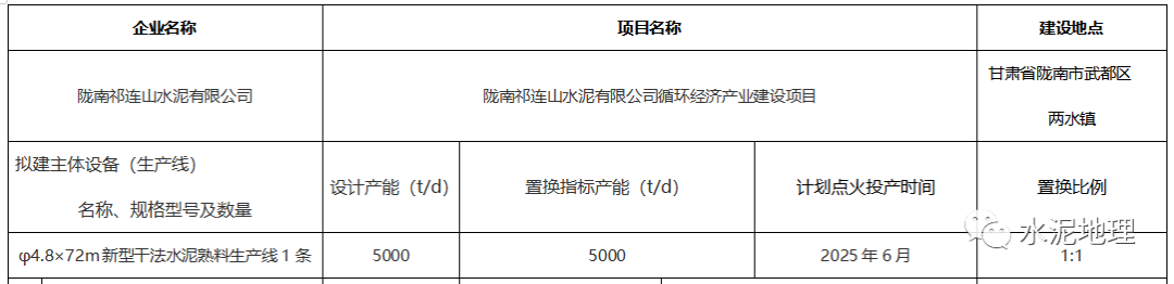陇南祁连山水泥有限公司循环经济产业建设项目合并迁建方案中提到,建设项目为一条5000t/d水泥熟料生产线,计划点火投产时间为2025年6月。退出项目分别为陇南祁连山水泥有限公司和文县祁连山水泥有限公司2500t/d熟料生产线各一条。