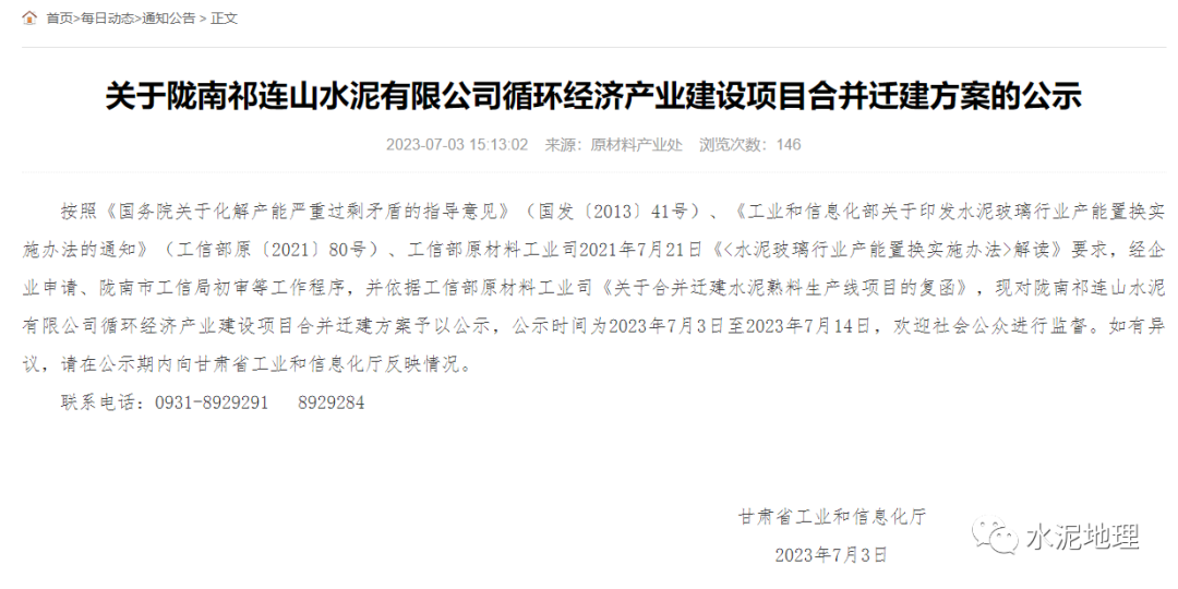 7月3日甘肃省工业和信息化厅发布《关于陇南祁连山水泥有限公司循环经济产业建设项目合并迁建方案的公示》称,按照相关文件要求,经企业申请、陇南市工信局初审等工作程序,并依据工信部原材料工业司《关于合并迁建水泥熟料生产线项目的复函》,现对陇南祁连山水泥有限公司循环经济产业建设项目合并迁建方案予以公示,公示时间为2023年7月3日至2023年7月14日,欢迎社会公众进行监督。如有异议,请在公示期内向甘肃省工业和信息化厅反映情况。
