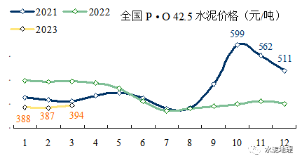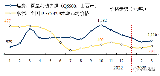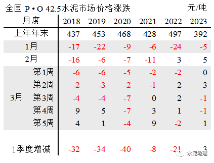 2022年末价格392元/吨,低出2018~2022年水泥平均价格457元/吨,有65元/吨之差。1月下降5元/吨,2月回涨5元/吨,3月价格一平两涨两跌,涨幅大于跌幅。2018~2022年水泥1季度平均降价27元/吨,2023年1季度价价格上涨3元/吨,较往年提前价格刹车,价差缩小了30元/吨。![]()