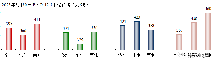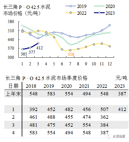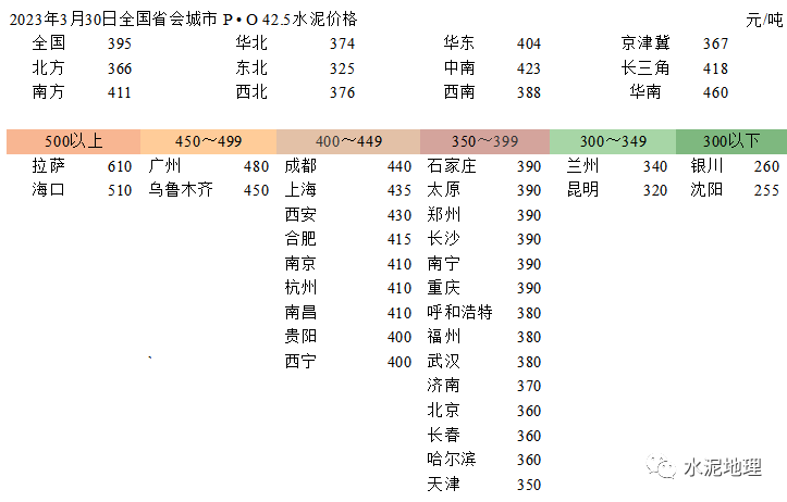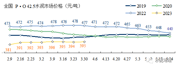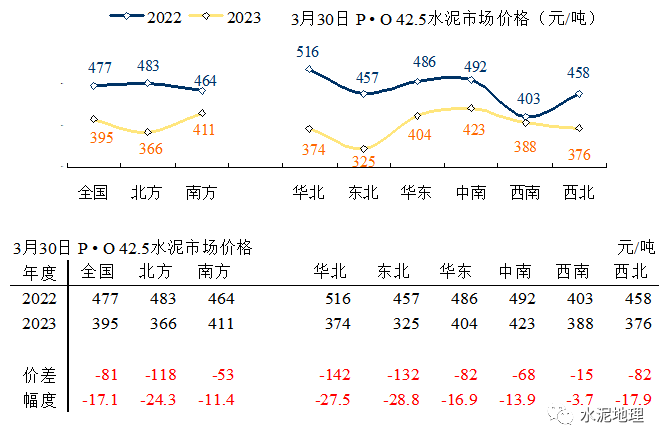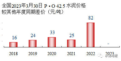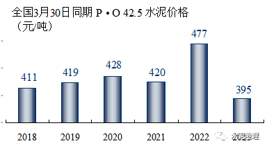2018年以来,年初全国P • O 42.5普通水泥价格均在400元/吨以上。3月30日,全国P • O 42.5 水泥价格395元/吨,与2018~2022年同期价格平均价差36元/吨(上周35元/吨),与2022年差价82元/吨。![]()