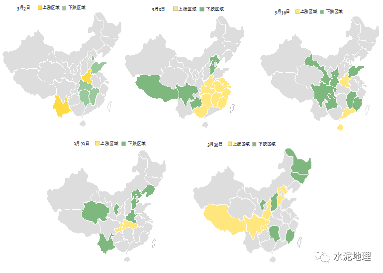 3月价格调整中,南方地区下面工程项目陆续开工,水泥需求增长。经过5周价格涨跌,3月合计较2月价格上涨3元/吨,上涨来自南方地区,尤其是川渝、长三角、两湖和华南地区。![]()