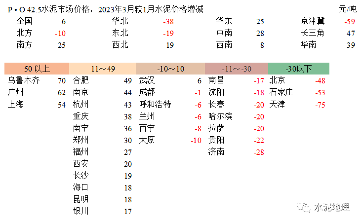 2023年1季度水泥价格较上年末价格上涨25元/吨,2018~2022年同期平均跌幅32元/吨。华南在价格水平和1季度价格拉涨方面都有不错表现。![]()