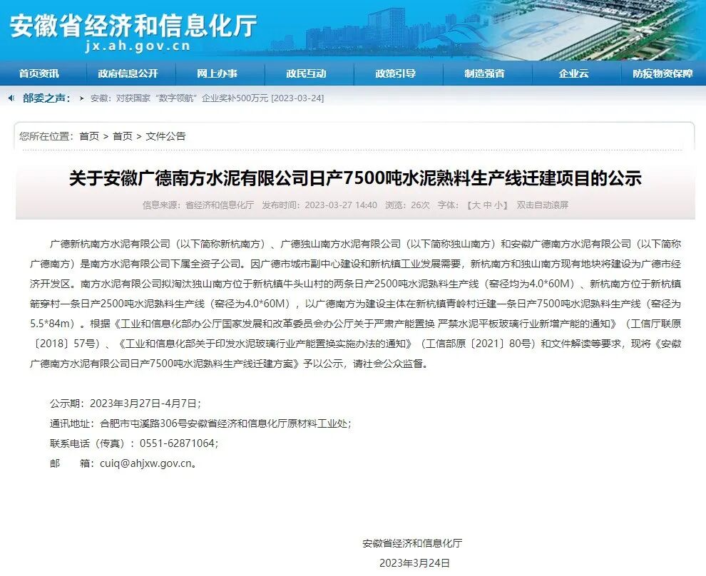 3月27日,安徽省经信厅发布《关于安徽广德南方水泥有限公司日产7500吨水泥熟料生产线迁建项目的公示》称,广德新杭南方水泥有限公司(以下简称新杭南方)、广德独山南方水泥有限公司(以下简称独山南方)和安徽广德南方水泥有限公司(以下简称广德南方)是南方水泥有限公司下属全资子公司。因广德市城市副中心建设和新杭镇工业发展需要,新杭南方和独山南方现有地块将建设为广德市经济开发区。