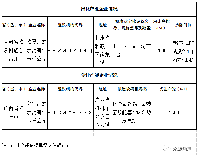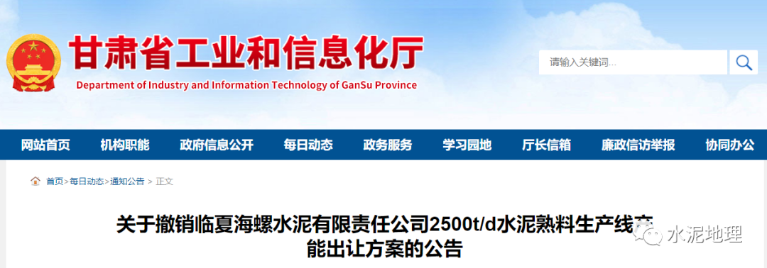 日前,甘肃工信厅发布“关于撤销临夏海螺水泥有限责任公司2500t/d水泥熟料生产线产能出让方案的公告”。
