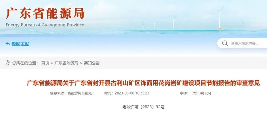 日前,广东能源局发布“关于广东省封开县古利山矿区饰面用花岗岩矿建设项目节能报告的审查意见”,内容显示,该项目采用的主要技术标准和建设方案符合国家相关节能法规及节能政策的要求,原则同意该项目节能报告。