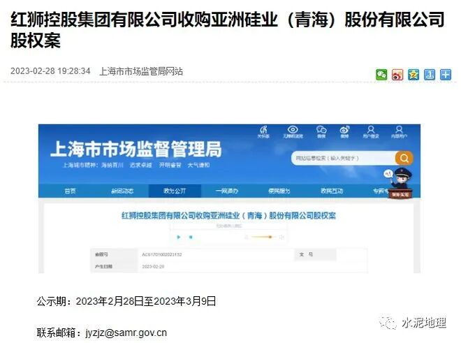 近日,上海市市场监督管理局发布《红狮控股集团有限公司收购亚洲硅业( 青海)股份有限公司股权案》。